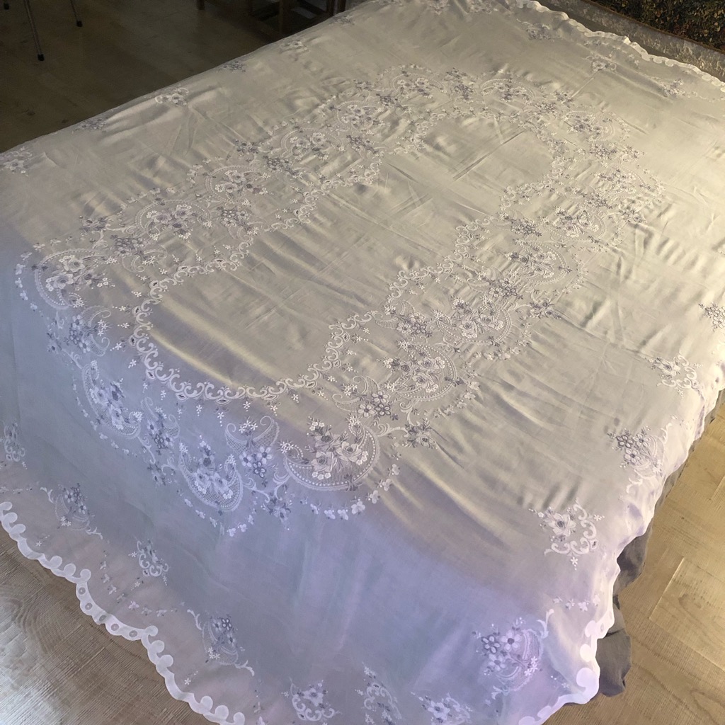 フランスのアンティークマーケットで見つけたヴィンテージマデイラ刺繍の大判テーブルクロスです。 グレーとホワイトの糸で陰影を描き出した見事な刺繍作品です。