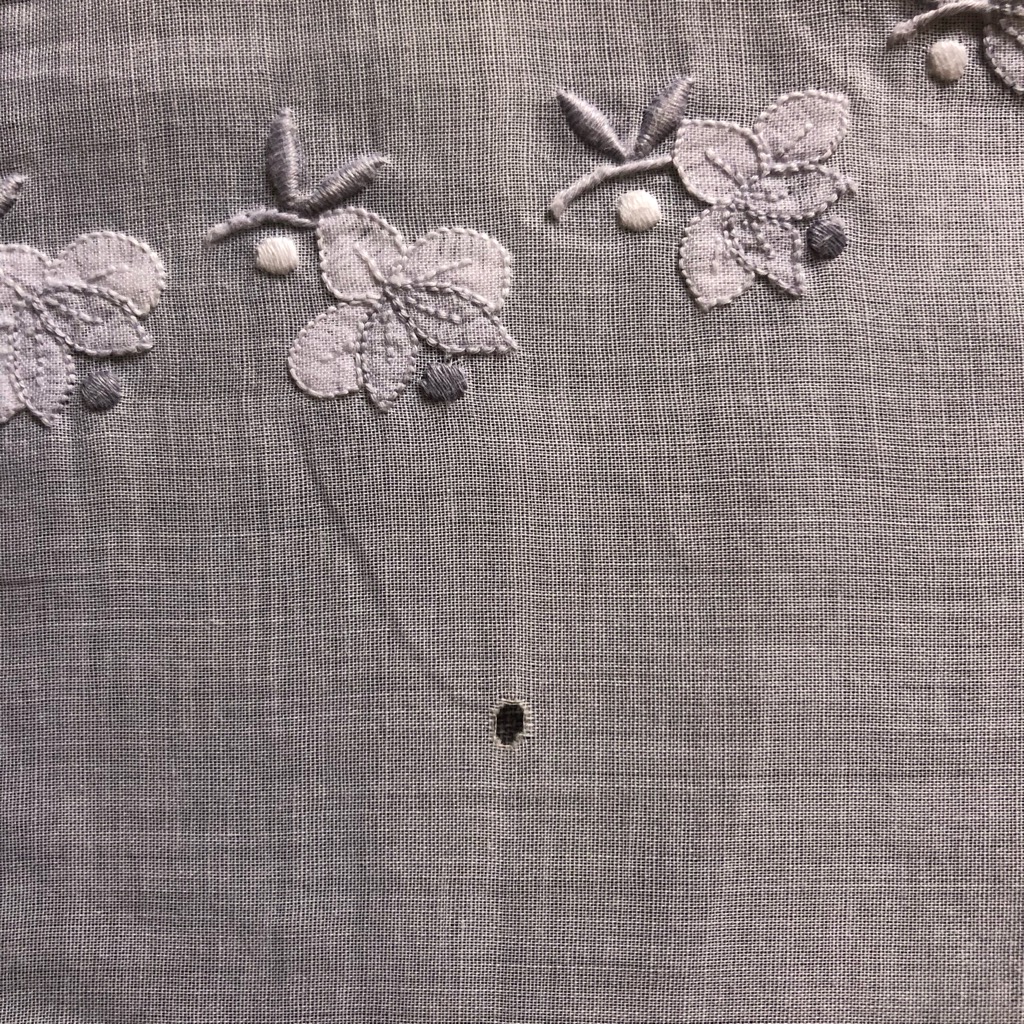 白の上質コットン生地に、緻密な手刺繍で描かれている薔薇の図案。 間違いなくマデイラ島で生産された テーブルクロスだと思います。 今まで扱った中でも特に緻密でエレガントな、芸術的と言って良い素晴らしい作品です。 シャドーワーク、ドロンワーク、アップリケ、気が遠くなりそうなサテンステッチ、ありとあらゆる 技法をこれでもかと言うくらいに使われている、刺繍が好きな方は唸るであろうトップクラスの作品です。 こちらはパリ近郊の アンティークマーケットで見つけました。 見事な細工は画像で十分ご理解いただけると思います。 大きなバンケットサイズ。 しかも色合わせがシックなので、少し格式を感じさせるディナーにぴったり。 マデイラ島の女性たちが長い年月で 磨き上げてきた技術の集大成のような作品です。 色にじみの心配が無いのでケアにも困りません。 クリーニング店にも安心して頼めます。 画像にあるように、ひとつだけ小さなホールがありますが、このままでもほとんど見た目に影響はありませんし、繕うのも難しくないと思います。 目立つダメージのないとても良い状態です。 size 幅163cm X 高さ252cm ≫商品のお問い合わせ |