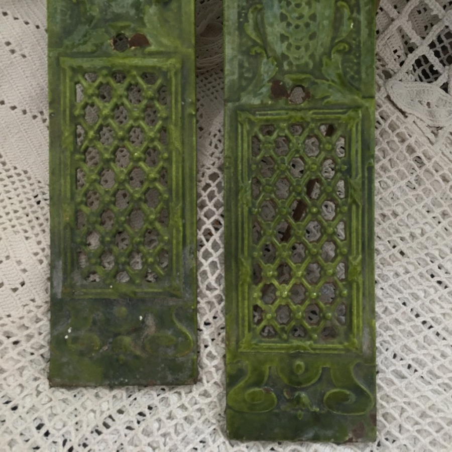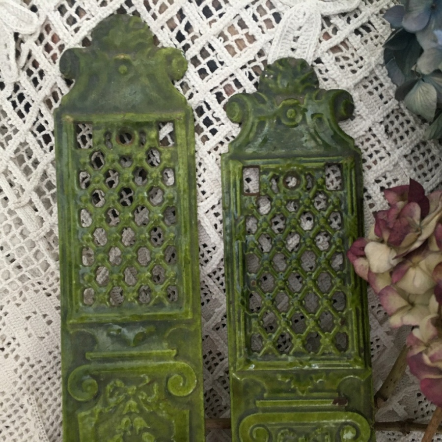 フランスのアンティークショップで手に入れたエナメルがけされたアイアンのペアのオーナメントです。 シャトーの門を飾っていたものだそうです。。 おそらくシャトーの門の石柱に嵌め込まれていたものでしょうか。 ずっしり重い厚みある鋳物鉄の装飾プレートに緑色のエナメルがかけられています。 長い年月を経た風情もあり、デザインも古風で美しいプレートです。 ガーデンゲートや、もちろんエントランスの装飾にご利用いただいても印象深いものになりそうな、なかなか手に入ることのないメタル装飾パーツです。 ごく小さくエナメルが剥げたところはありますが、それもアンティークの風情と思います。 全体としては欠けたパーツもなく美しい状態です。。 幅8p 高さ55cm ≫商品のお問い合わせ |