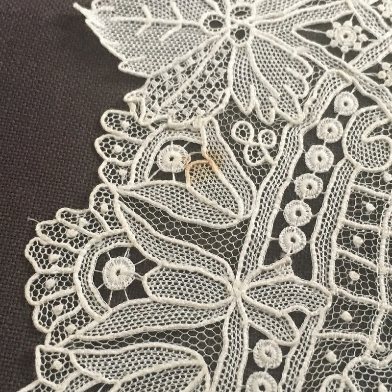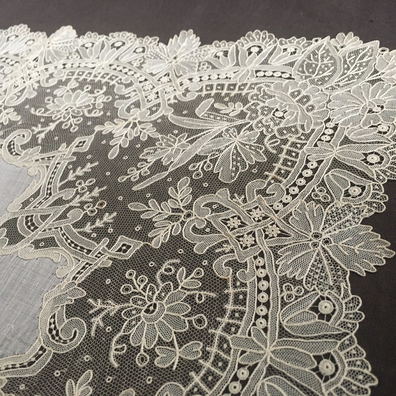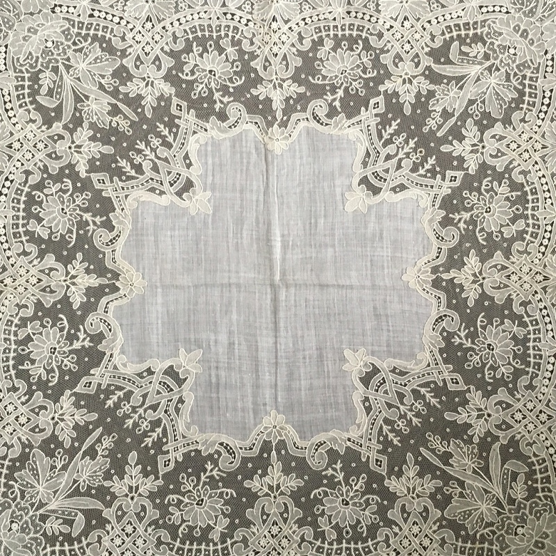 パリで見つけたポワンドガーズのハンカチです。 レース部分が大きく、生地とのつながりも曲線になっていて、とても迫力のある作品です。 ポワンドガーズは極細の麻糸を針で編んでいくニードルレース手法です。 19世紀に技術が出来上がり、そのあまりの手間故に20世紀になる頃にはマシンレースの普及により生産はなくなりました。 また、編む技術にのみ注目がいきますが、この糸をつむぐことができるのは、トルコ絨毯の極上の物が10代の少女たちによってなされるのと同じく、幼い、手先が器用な視力の良い少女のみによって可能なことでした。 アンティークマーケットでも非常に人気が高く、なかなかご紹介はできませんが、これからも探していきたいと思います。 ごくごく小さなネットブレイクがひとつと、褐色のスポットがひとつありますが、ディスプレイで目に付くことはありません。 150年近くの時を経たレースとしては素晴らしい状態です。 size 35cm x 35cm |