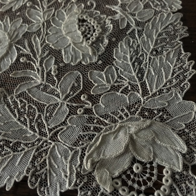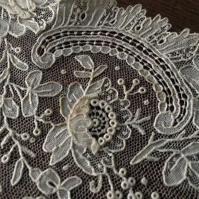 パリで見つけたポワンドローズのウェディングハンカチーフです。 見つけた時には一瞬我が目を疑いました。 素晴らしいコンディションんで、しかも花びらが立体的に作られたポワンドローズです。 薔薇の図案が描かれる物はもちろんありますが、花びらを重ねる立体的なつくりの作品はそんなに多くはなく、しかもこんなに状態の良い物が目の前にあるなんてと見入ってしまいました。 一期一会をかみしめて、意を決して手に入れました。 思えばはじめて理解して手に入れてから15年が過ぎました。 アンティークレースへのめり込んでも、そうそう手にできる物ではありません。 でも、時々私の前にふわっと現れてくれる、いつもレースとの出会いはそんな感じです。 このレースは、薔薇のパターンごとの花びらの重なりが多く、また、生地のように編み上げられている部分の滑らかな雰囲気がが他の物より際立っています。 全体にかけられたエネルギーはいかほどかと思います。 ダブル、トリプルに重なった部分の濃い陰影が、ディスプレイした時にひときわ映えます。 そして、わずかな変色箇所はあるものの、全くブレイクのない素晴らしいコンディション。 値段交渉の時にはそれが一番ディーラーも力を込めて訴えてきたことで、私自身それがどれだけすごいことかわかっているため、最終的に譲ったのは私でした。 そんな出来事を含めて、やはり心に残る1枚です。 今回は2枚ご紹介できる幸運に恵まれました。 どちらもディスプレイで存分にお楽しみいただきたい作品です。 全体の経年のうっすらした褐色っぽい変色と、いくつかの褐色のスポット以外にはブレイクやホールはない素晴らしいコンディションです。 size 34cm X 35cm(生地縦横18x19) |