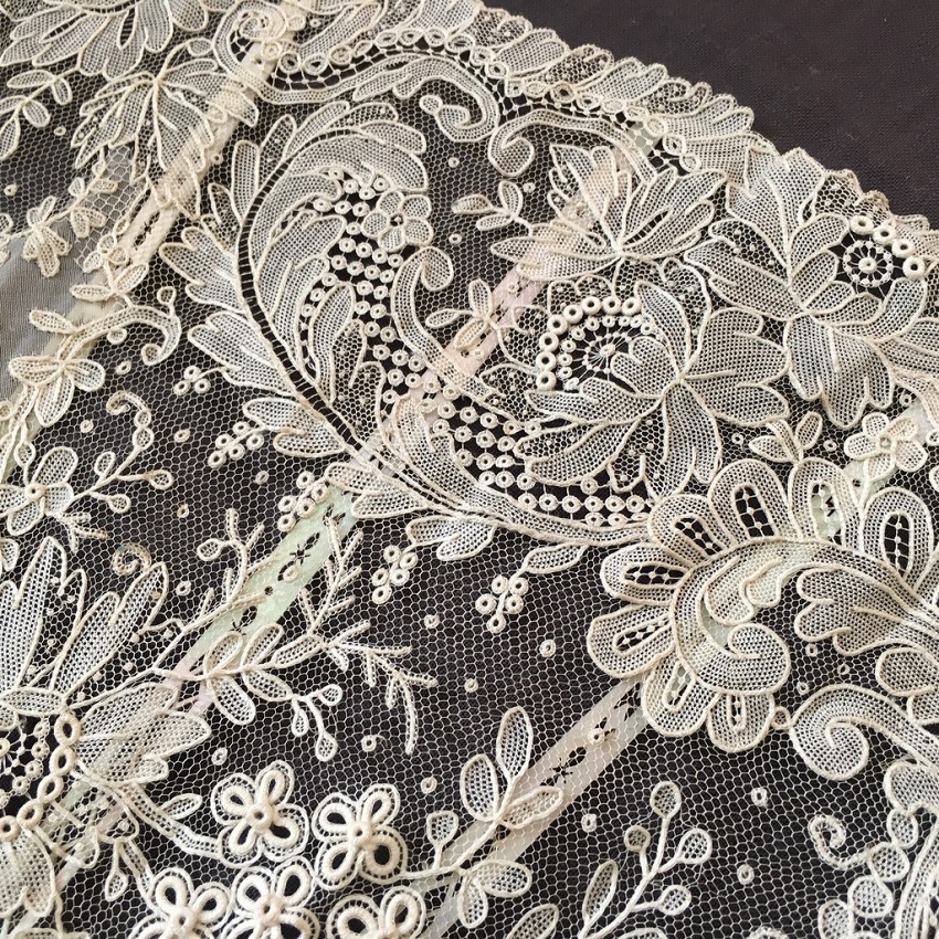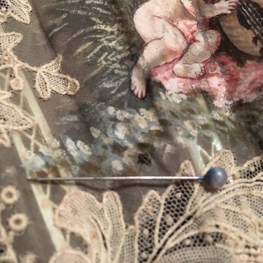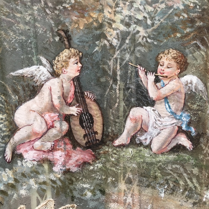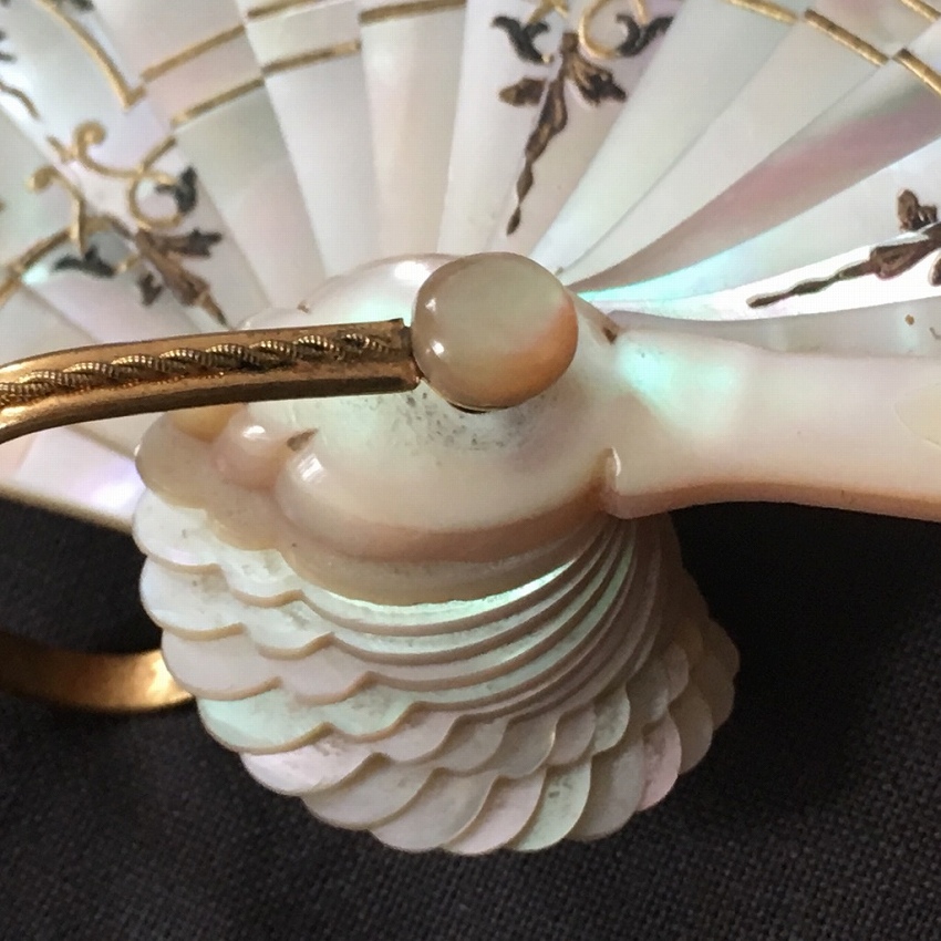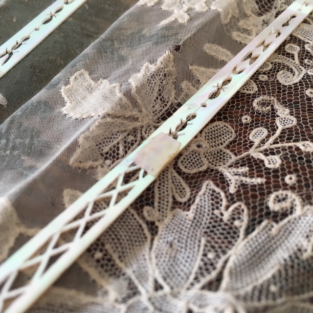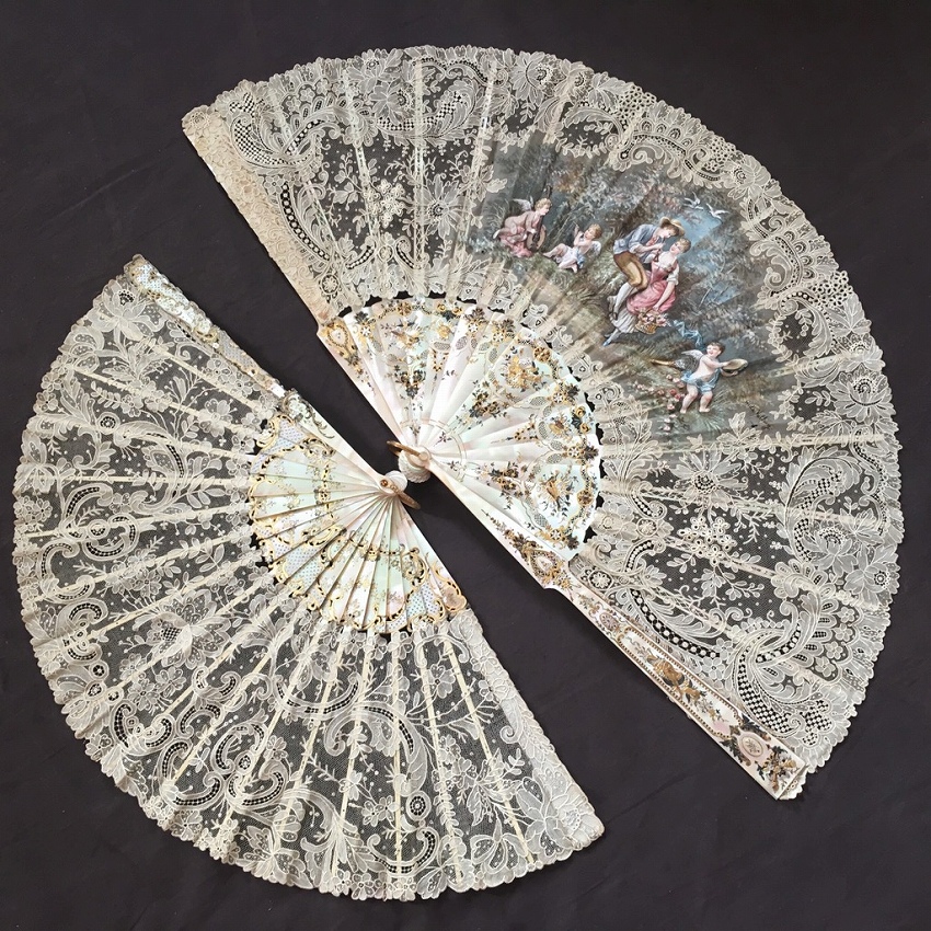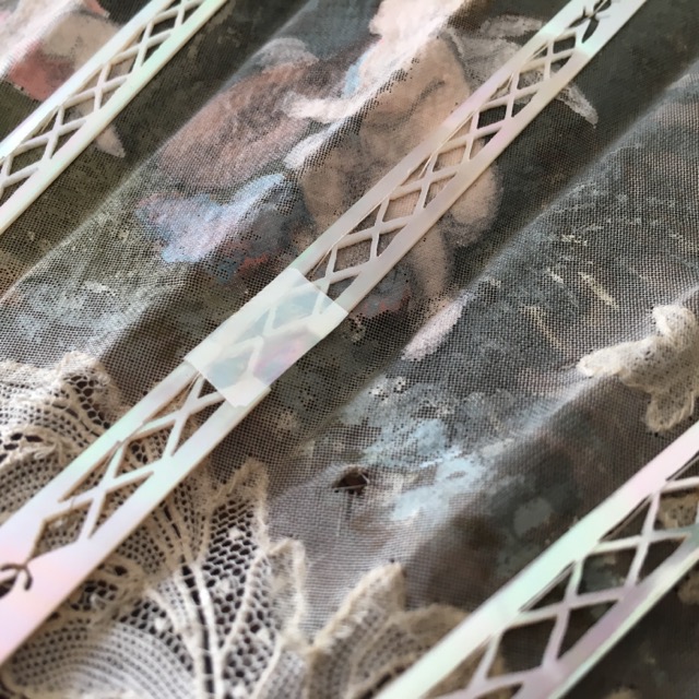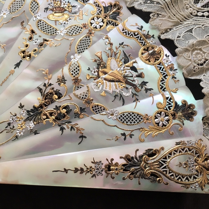 パリで見つけたポワンドガーズとシルクペイントの扇子です。 ポワンドガーズは常に探しているのですが、こちらの扇子には優美なシルクペイントが嵌め込まれています。 ぴったりとポワンドガーズのレース部分につながるように作られていて、全体の仕上がりが素晴らしい。 また、サイズも大きく、もうひとつご紹介しているファンとの対比でわかっていただけると思いますが、かなり存在感のある大きさです。 そして更に特筆に価するのが蝶貝細工です。 画像でもわかっていただけると思いますが、ここまでの細工の物で、しかもポワンドガーズ利用の物はめったにないと思います。 天使と若い農夫のカップルの描写の素朴でありながら華やかな美さと、細工の見事な蝶貝部分が溶け合うようにしてかもし出す全体の雰囲気は圧倒的な存在感です。 骨2本が折れていたため、蝶貝を手に入れて補修しました。 表面には影響していません。 シルクペイント部分に極小さなホールが数個ありますがディスプレイして目立つものではありません。 レースにはダメージはありません。 size 開いて幅62cm 閉じて長さ33cm レース幅20? |