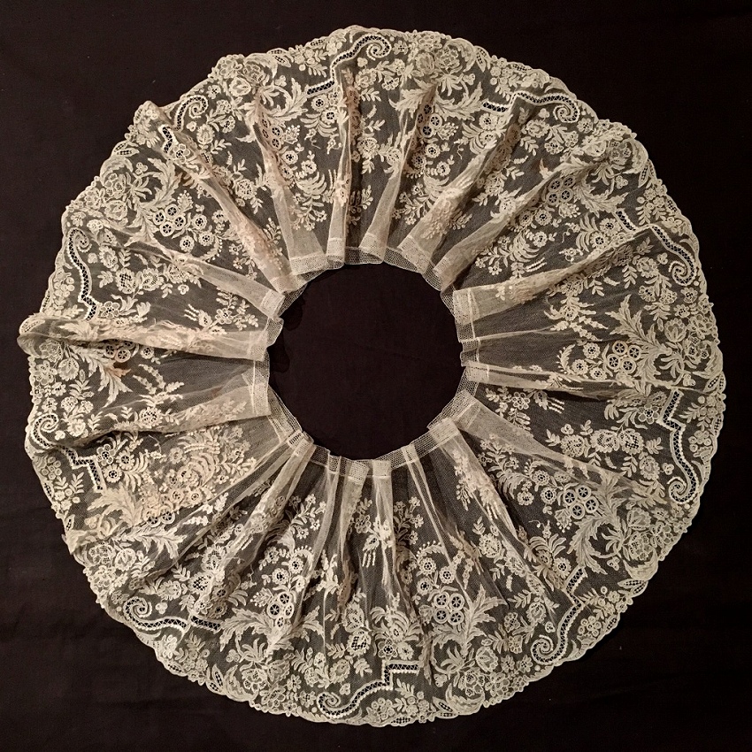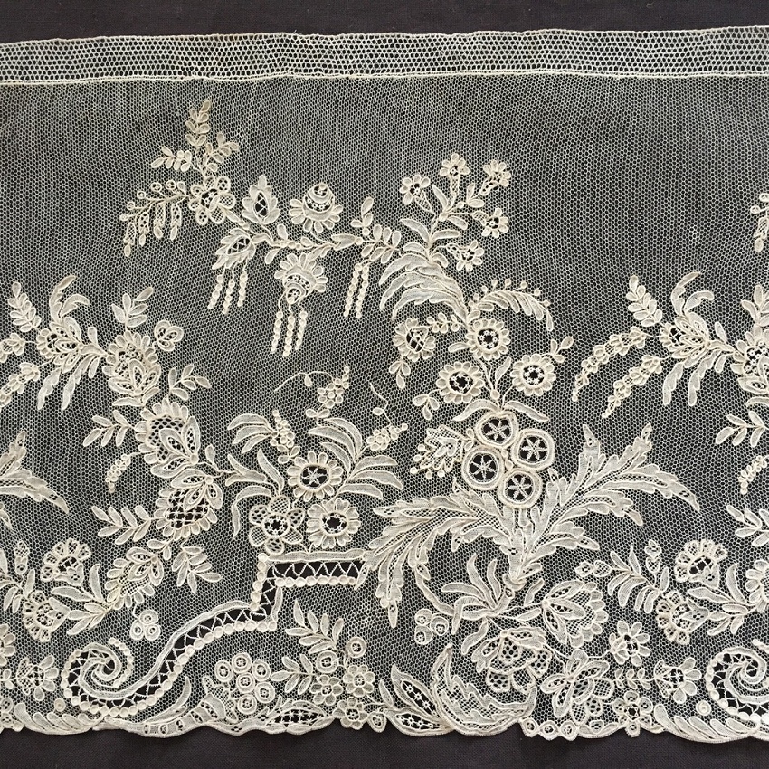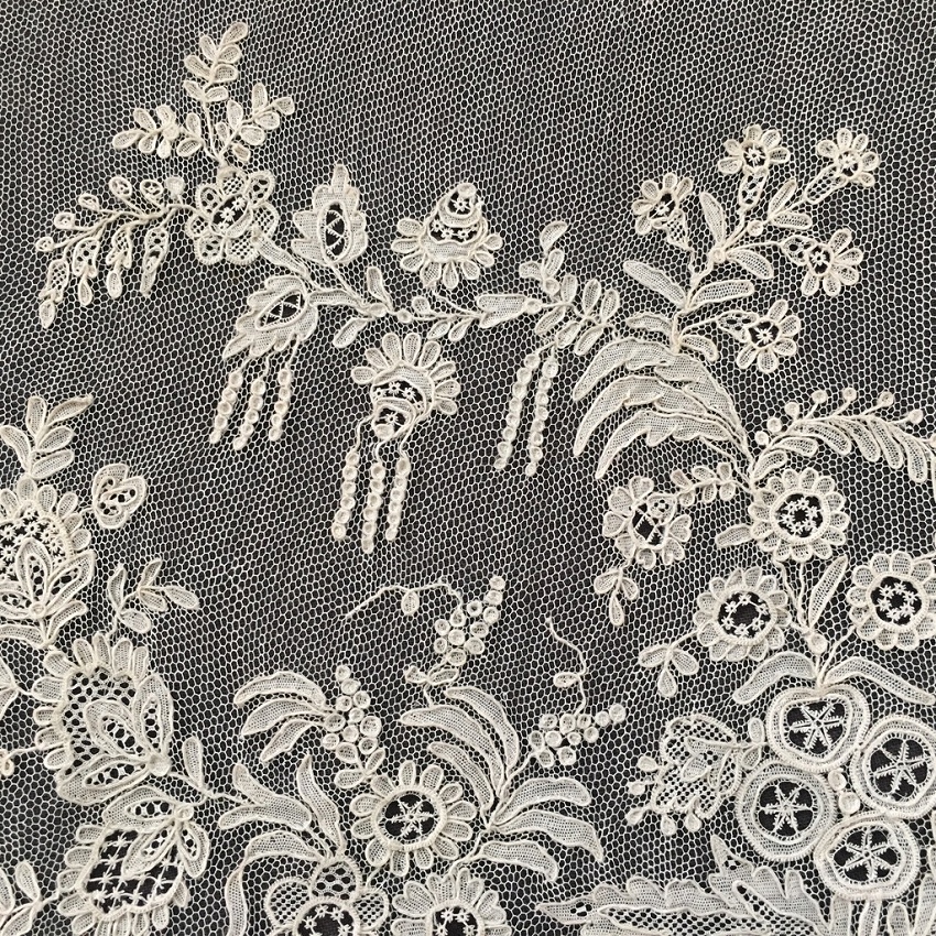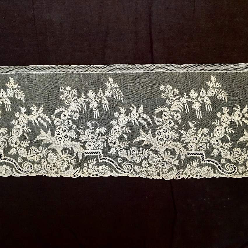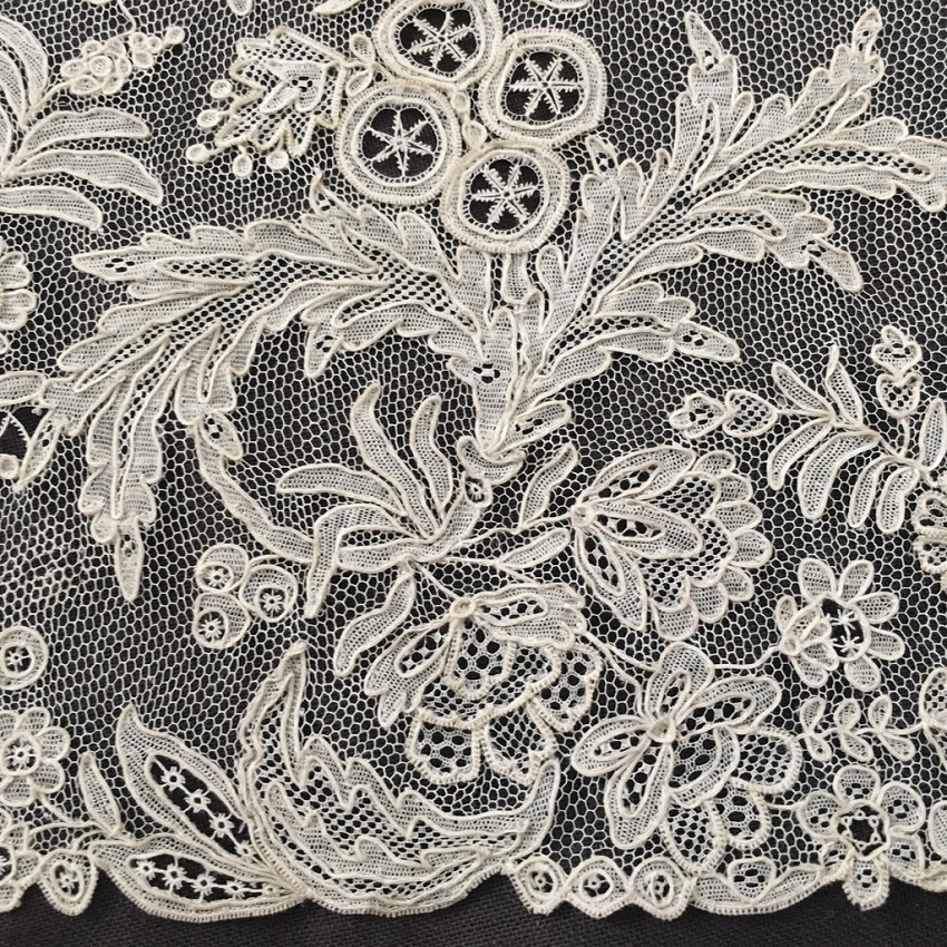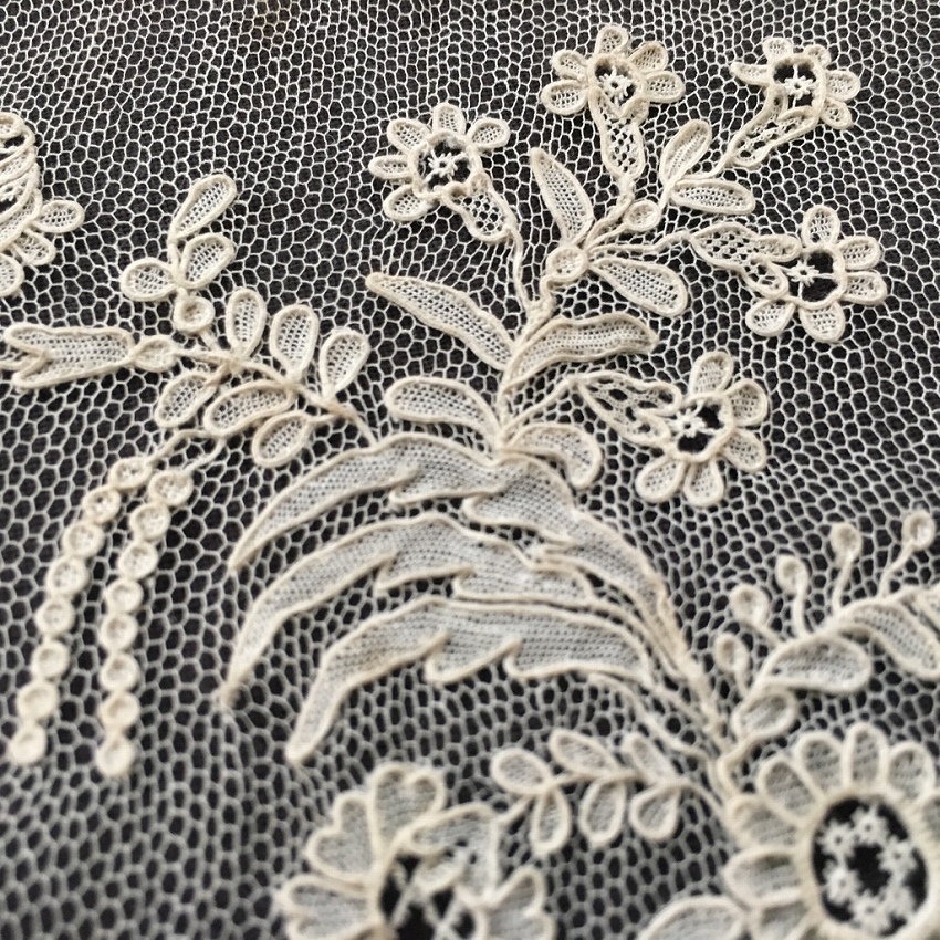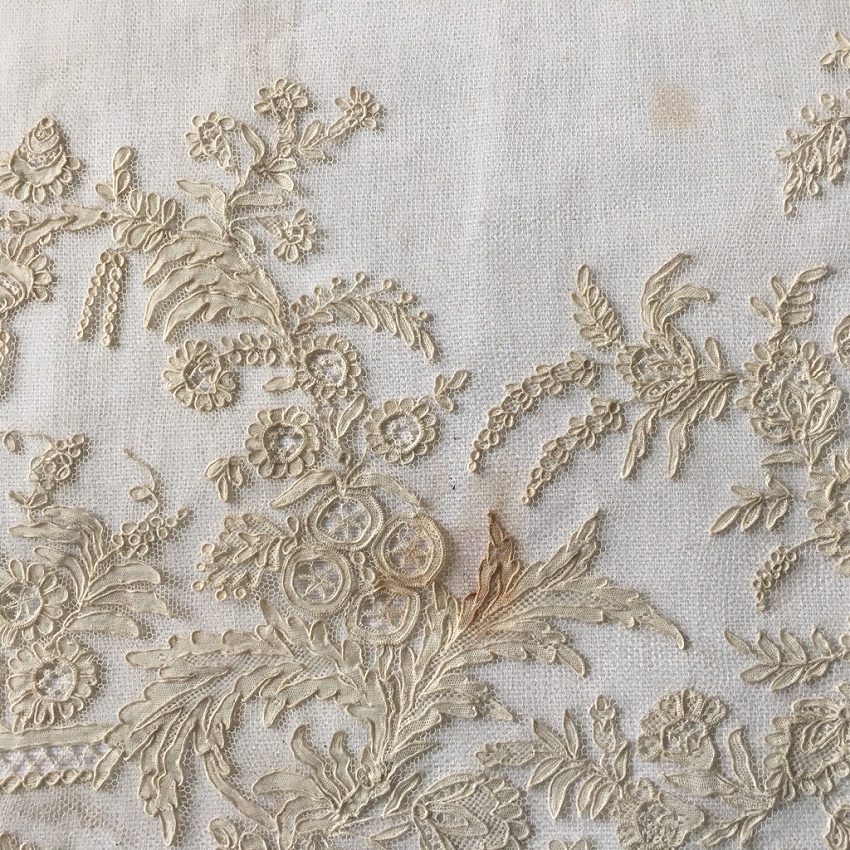 ロンドンで見つけたアランソンレースの幅広ボーダーです。 はじめて手にするアランソンレースです。 画像では知っていても、実物は破片のような部分、細すぎるボーダーなどしか見たことはなく、その手法を実感して見たことはありませんでした。 今回ロンドンのマーケットで見つけ、一瞬ポワンドガーズかと思ったのですが、どうもそうではないと感じて、まじまじ見たらラベルにはアランソンレースと書いてあります。 なるほどと思いました。 ポワンドガーズよりさらに図案が細かく、繊細で、それでいて手触りはしっかりとしています。 ニードルレースの最高峰という意味がわかりました。 写真ではとても息をのむ手作業の素晴らしさをお伝えできません。 ポワンドガーズよりもネットグラウンドは細かいので、霞のような白い雰囲気があります。 デザインも細かく、一層写実的な描写がなされていると感じます。 保管による変色スポットがあるものの、ブレイクなど一切なく、素晴らしいコンディションです。 製作されたのは1800年代半ばの、ナポレオン3世時代です。 フランス革命前に王侯貴族のために作られ、革命で燃やされ、18世紀のものはほとんどないと聞きます。 ナポレオン3世時代に復刻製作されましたが、かかる手間がポワンドガーズよりも甚大なために量産は出来なかったようです。 市場にもほとんどなく、ずっと探していて今回やっと手にすることができました。 そして、このような大作はもう今後手にすることはないだろうと思っています。 size 幅21cm(縫い付け部分が1cm 弱) 長さ196? |