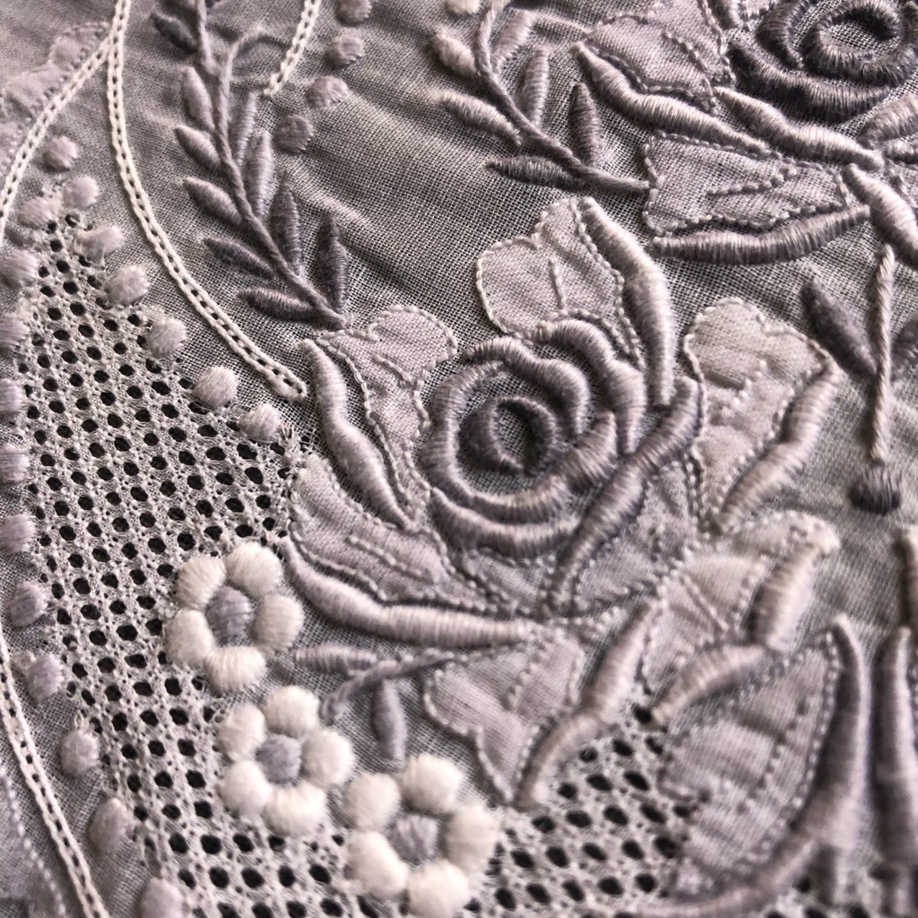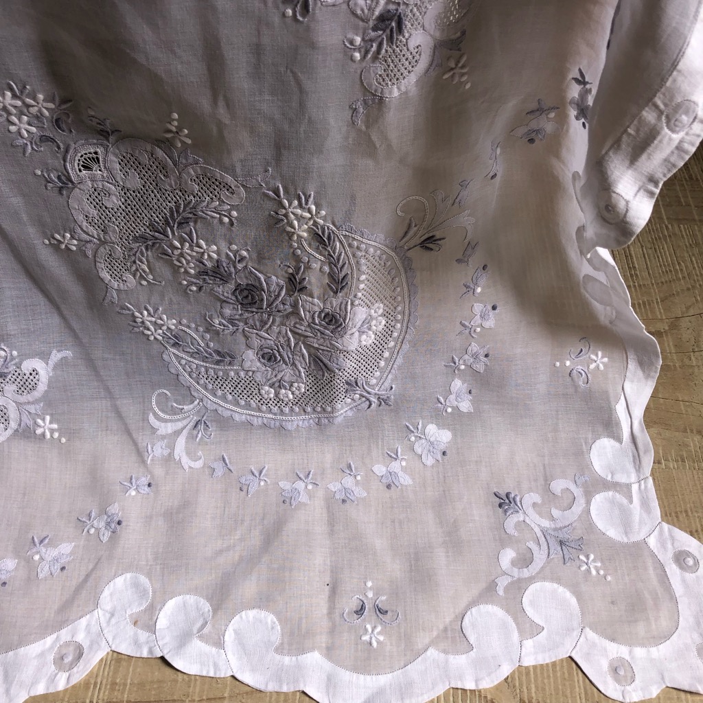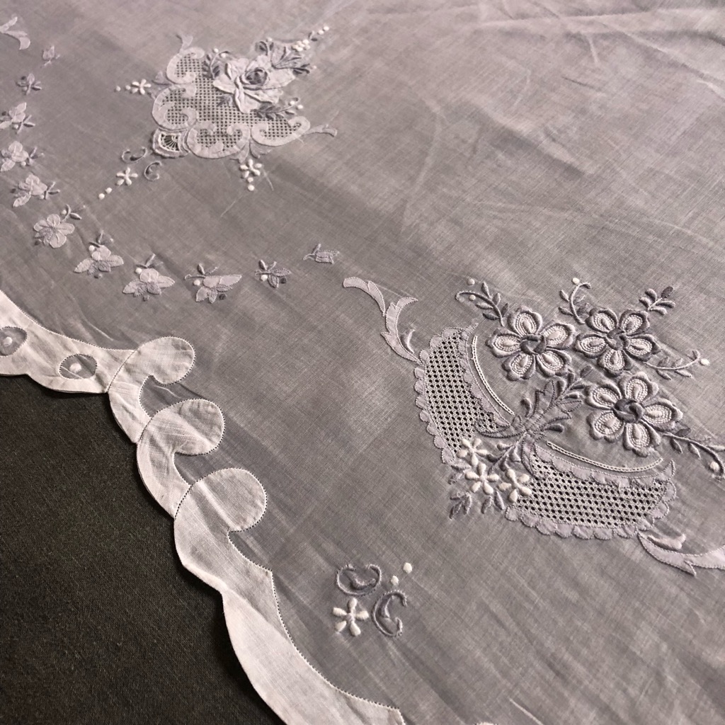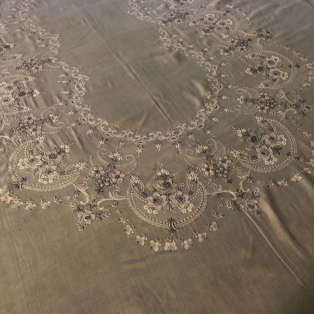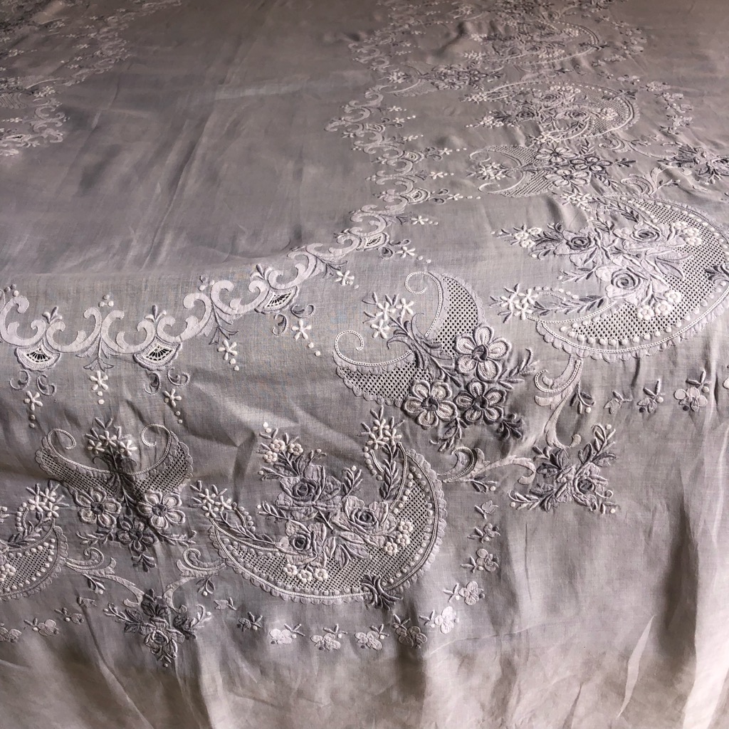 フランスのアンティークマーケットで見つけたヴィンテージマデイラ刺繍の大判テーブルクロスです。 グレーとホワイトの糸で陰影を描き出した見事な刺繍作品です。